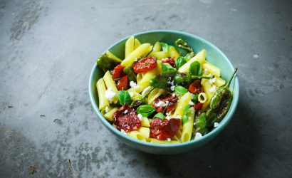PASTA MIT OFENGERÖSTETEN KIRSCHTOMATEN, PIMIENTOS DE PADRON & ZIEGENFETA