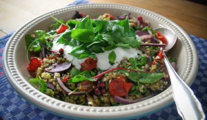 Sommer-Salat mit Grünkern, Ofentomaten & griechischem Joghurt